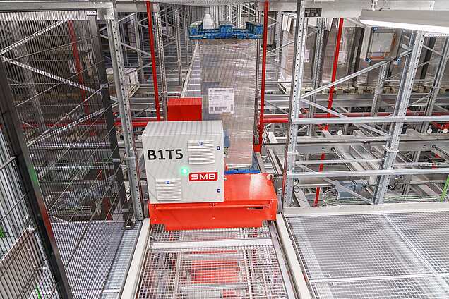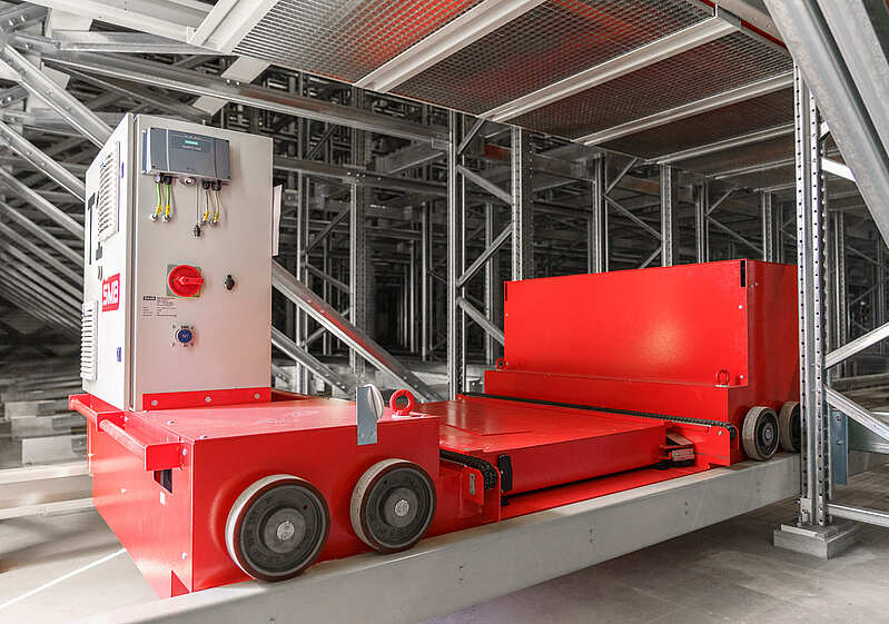The majority of our customers at SMB use pallet shuttles with trailing cables. Our tethered pallet shuttles are a proven advantage of our truck shuttle system, which we use to optimize our Automated Pallet Warehouse for high performance and maximum space utilization.