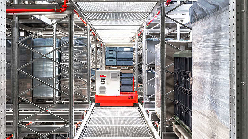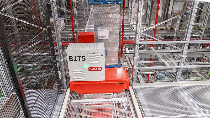 This is our setup at SMB: first, the pallet is transported to the appropriate storage level using a vertical conveyor, or pallet elevator. Once it arrives, our truck with pallet shuttle takes over the load carrier from the buffer zone.