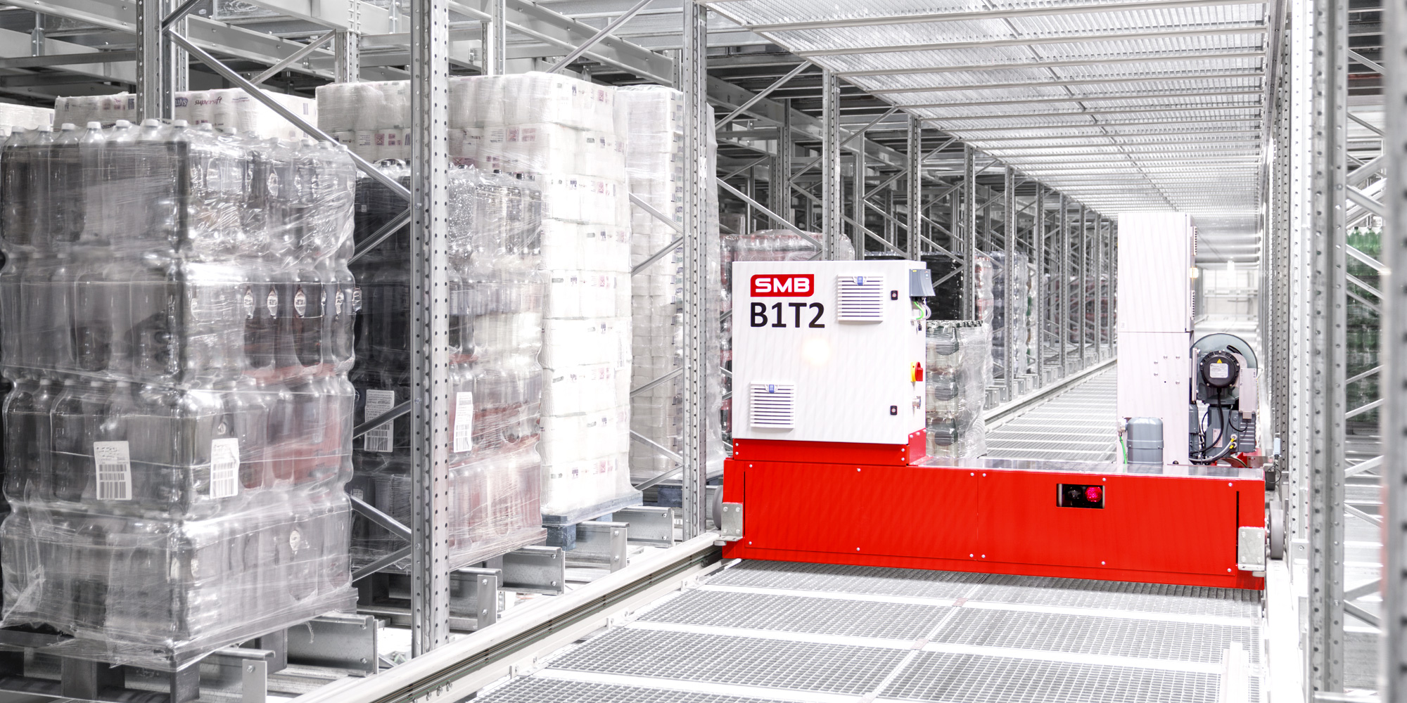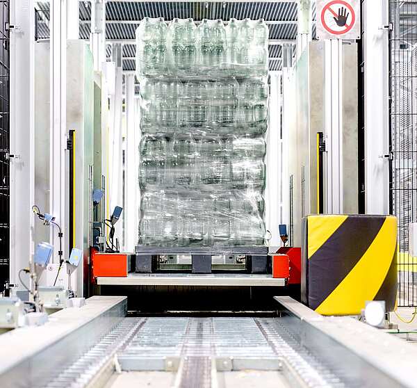The system processes pallets fully automatically – without changeovers, external pallet stacker or separate storage areas. Precisely programmed acceleration and braking profiles prevent the load from slipping. In the goods issue area, the pallets are ready and sorted by order, enabling store-specific picking of beverage containers, fast-moving items or promotional goods, while at the same time minimising the risk of incorrect deliveries.