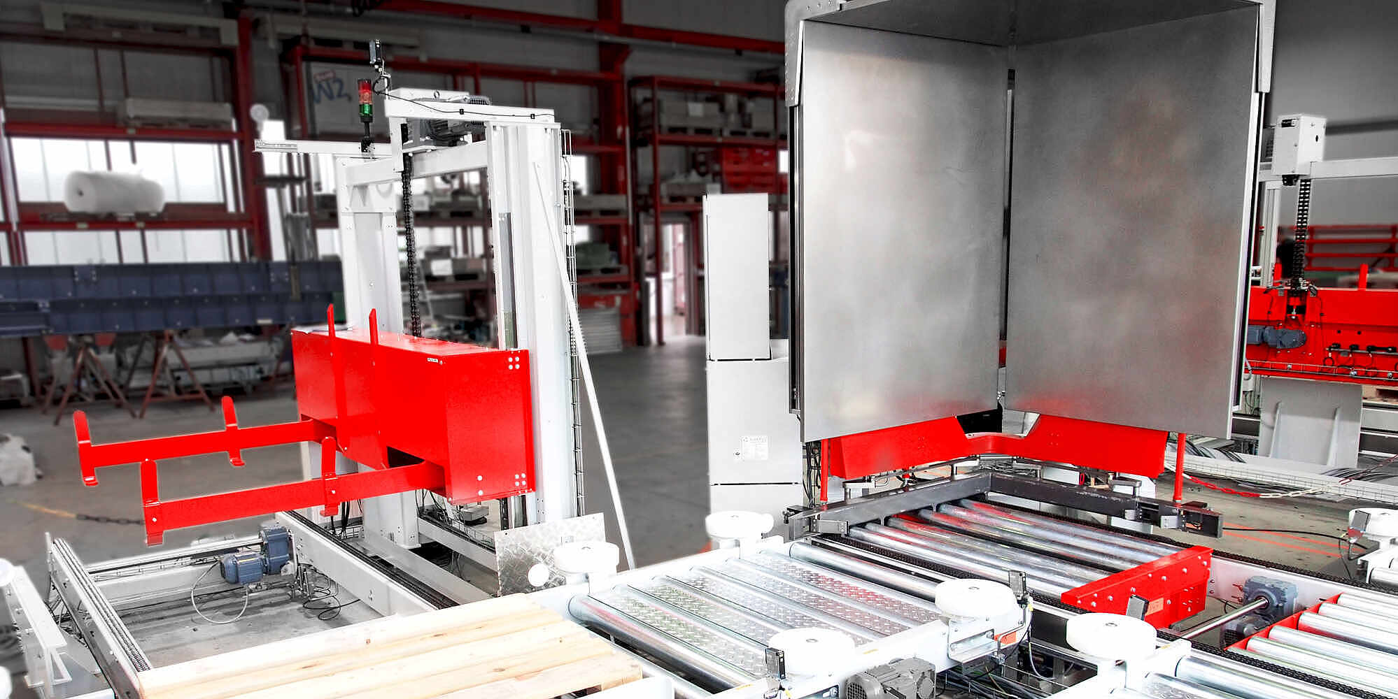 We produce the tilting pallet exchanger in cooperation with the company NORTEC Automation GmbH. It is delivered completely pre-assembled and is available in different performance classes. Expansion functions, such as a protective sheet separator, can be booked individually. The control software of the pallet changer is created by specialists so that the palletizer can be individually adapted at any time. In continuous quality assurance, we incorporate the experiences of the users.